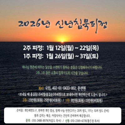 매년 기도하는 사람들이 모여 침묵과 고요 속에 함께 했던 시간이 참으로 복된 시간이었습니다. 새해를 맞아 보다 관상기도를 통해 침묵과 고요 속에서 새해를 시작하고자 하는 설렘 공동체 여러분을 이 복된 시간에 초대합니다.